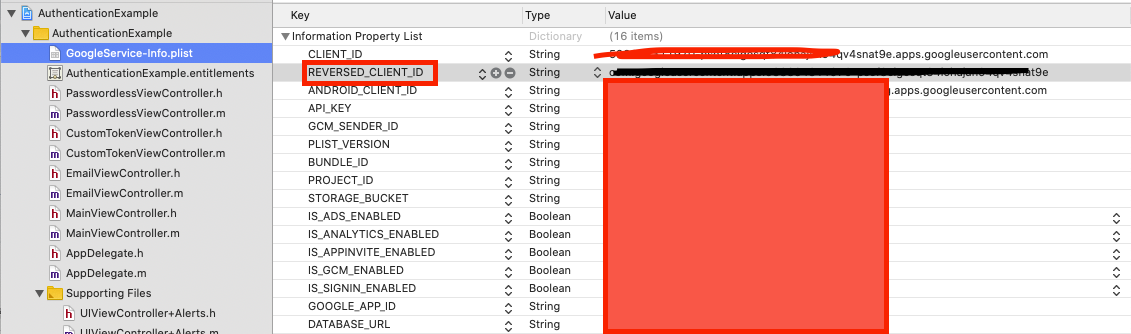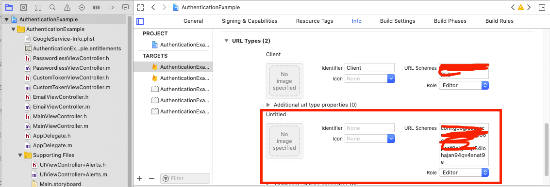 Xcode의 프로젝트 navigation bar에서 프로젝트 이름을 클릭하고‘TARGETS’->‘Info’->‘URL Types’으로 이동하십시오. 그런 다음 '+'버튼을 클릭하고 뒤집힌 client ID를 'URL Schemes'에 추가하십시오. ‘GoogleService-Info.plist’의 목록중 REVERSED_CLIENT_ID에서 클라이언트 ID를 얻을 수 있습니다.
